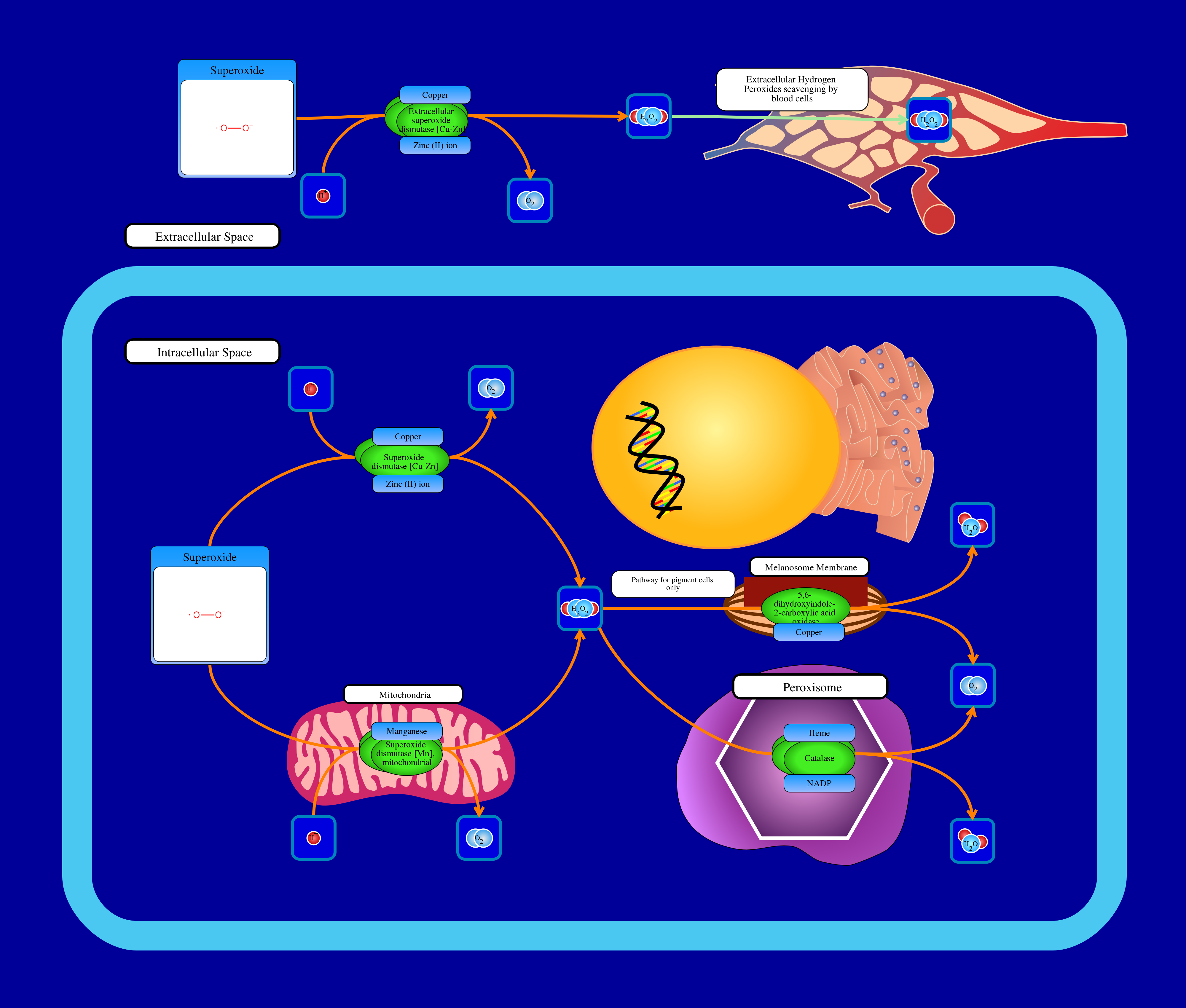 Reactive oxygen species (ROS) are formed by the normal metabolic process of oxygen. Examples are superoxide, oxygen ions and peroxides and can be of either organic or inorganic origin. ROS are highly reactive due to unpaired valence shell electrons, and can cause serious damage to cells and cell organelles. The environment also may cause ROS to form, from sources such as drought, air pollutants, UV light, cold temperatures, and external chemicals. An organic example of ROS being formed is during the beta oxidation of fatty acids, or photorespiration in photosynthetic organisms. Aerobic organisms who produce energy through the electron transport chain in mitochondria produce ROS as a byproduct. ROS damage commmonly includes DNA damage, lipid peroxidation, oxidation of amino acids in proteins, and oxidatively inactivating enzymes by oxidation of cofactors. Most aerobic organisms have adapted to this dangerous condition of life, and have a system of enzymes and scavenging free radicals. Enzymes such as are essential for defense against ROS, and include superoxide dismutases (SODs) and hydroperoxidase (CAT). Superoxide dismutases are the primary method of disposal of ROS, and convert superoxide radicals to hydrogen peroxide and water. Catalase attacks the hydrogen peroxide produced by SODs, and converts it into oxygen and water. In skin cells, 5,6 dihydroxyindole-2-carboxylic acid oxidase in the melanosome membranes breaks down hydrogen peroxide into water and oxygen.