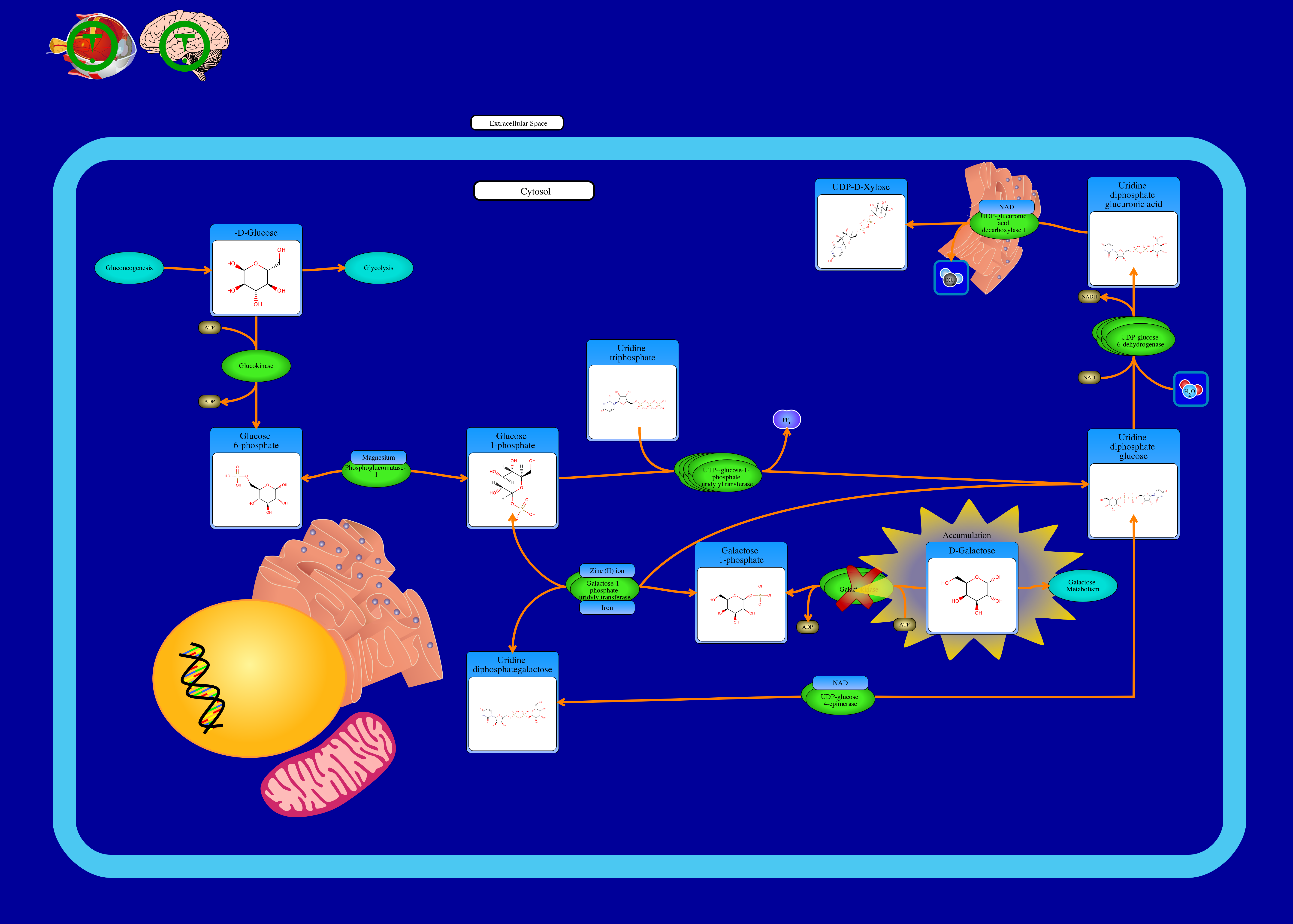 Glucokinase Phosphoglucomutase- 1 UTP--glucose-1- phosphate uridylyltransferase UDP-glucose 6-dehydrogenase UDP-glucuronic acid decarboxylase 1 Galactose-1- phosphate uridylyltransferase Galactokinase UDP-glucose 4-epimerase α-D-Glucose Accumulation D-Galactose ATP ADP Glucose 6-phosphate Glucose 1-phosphate Uridine triphosphate Uridine diphosphate glucose PPi NAD H2O Uridine diphosphate glucuronic acid NADH UDP-D-Xylose CO2 Uridine diphosphategalactose Galactose 1-phosphate ATP ADP Magnesium NAD Iron Zinc (II) ion NAD Gluconeogenesis Glycolysis Galactose Metabolism Cytosol Extracellular Space