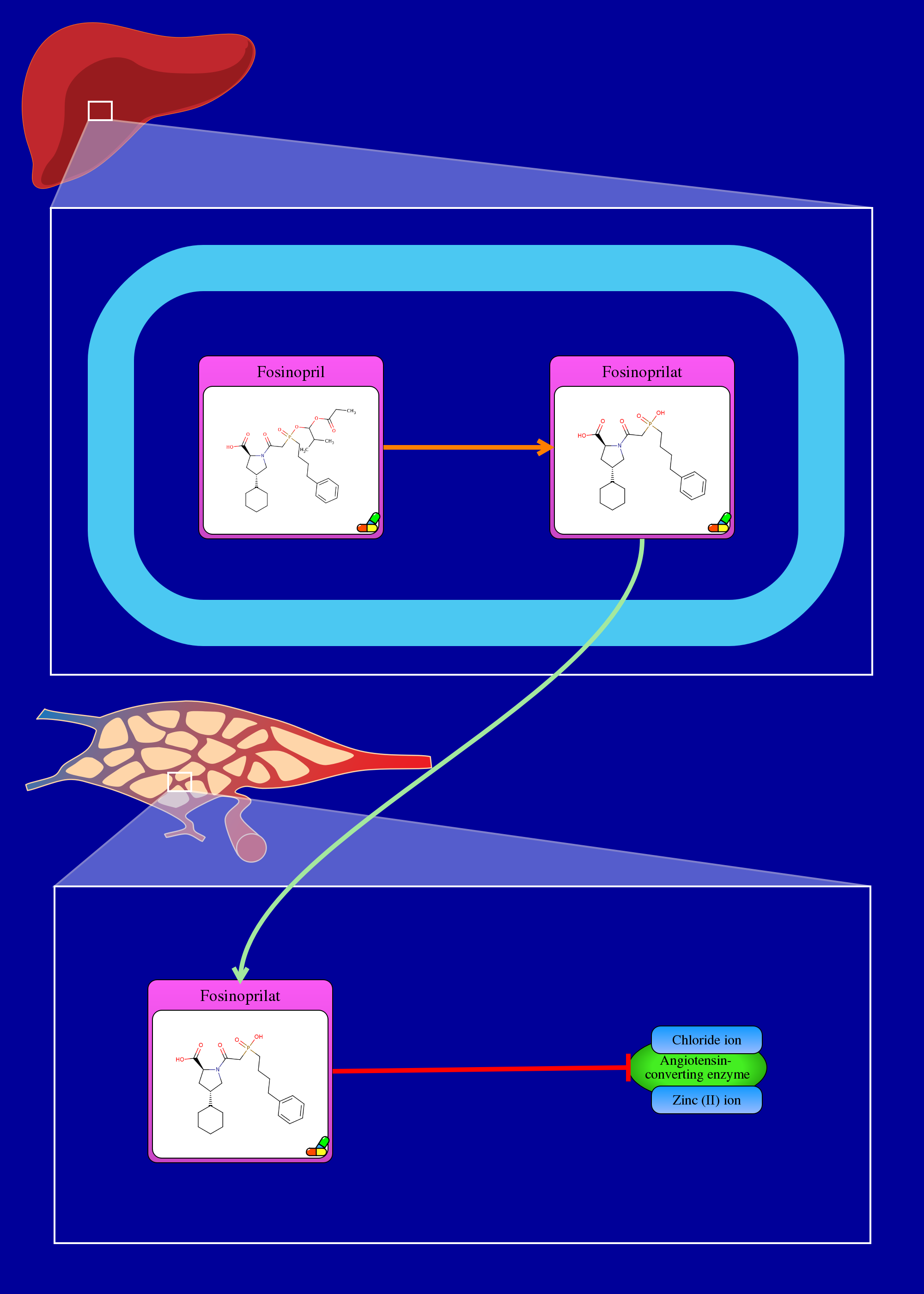 Fosinopril (trade name: Monopril) belongs to the class of drugs known as angiotensin-converting enzyme (ACE) inhibitors and is used primarily to lower high blood pressure (hypertension). This drug can also be used in the treatment of congestive heart failure and type II diabetes. Fosinopril is a prodrug which, following oral administration, undergoes biotransformation in vivo into its active form fosinoprilat via cleavage of its ester group by the liver. Angiotensin-converting enzyme (ACE) is a component of the body's renin–angiotensin–aldosterone system (RAAS) and cleaves inactive angiotensin I into the active vasoconstrictor angiotensin II. ACE (or kininase II) also degrades the potent vasodilator bradykinin. Consequently, ACE inhibitors decrease angiotensin II concentrations and increase bradykinin concentrations resulting in blood vessel dilation and thereby lowering blood pressure.