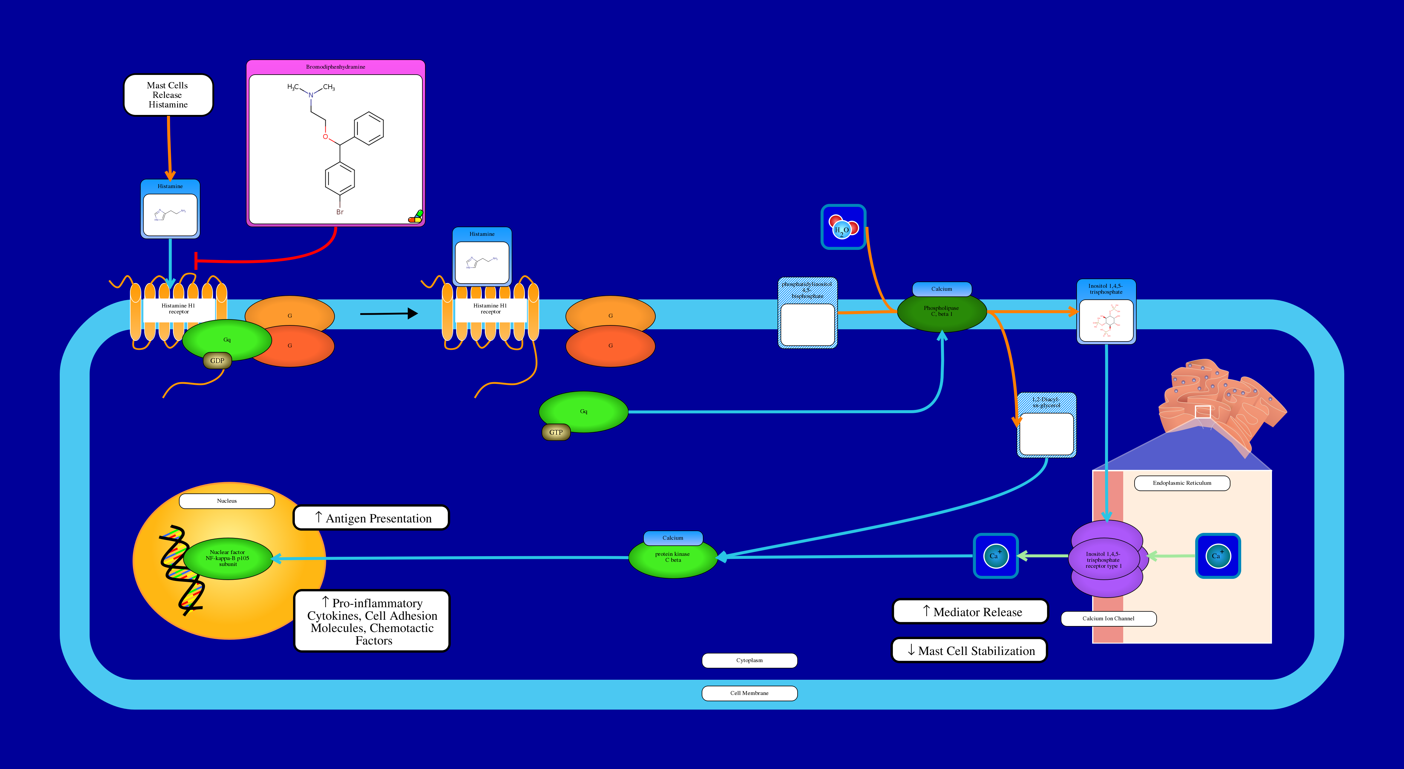Bromodiphenhydramine (Bromazine) is a first-generation ethanolamine H1-antihistamine. H1-antihistamines interfere with the agonist action of histamine at the H1 receptor and are administered to attenuate inflammatory process in order to treat conditions such as allergic rhinitis, allergic conjunctivitis, and urticaria. Reducing the activity of the NF-κB immune response transcription factor through the phospholipase C and the phosphatidylinositol (PIP2) signalling pathways also decreases antigen presentation and the expression of pro-inflammatory cytokines, cell adhesion molecules, and chemotactic factors. Furthermore, lowering calcium ion concentration leads to increased mast cell stability which reduces further histamine release. First-generation antihistamines readily cross the blood-brain barrier and cause sedation and other adverse central nervous system (CNS) effects (e.g. nervousness and insomnia). Second-generation antihistamines are more selective for H1-receptors of the peripheral nervous system (PNS) and do not cross the blood-brain barrier. Consequently, these newer drugs elicit fewer adverse drug reactions.