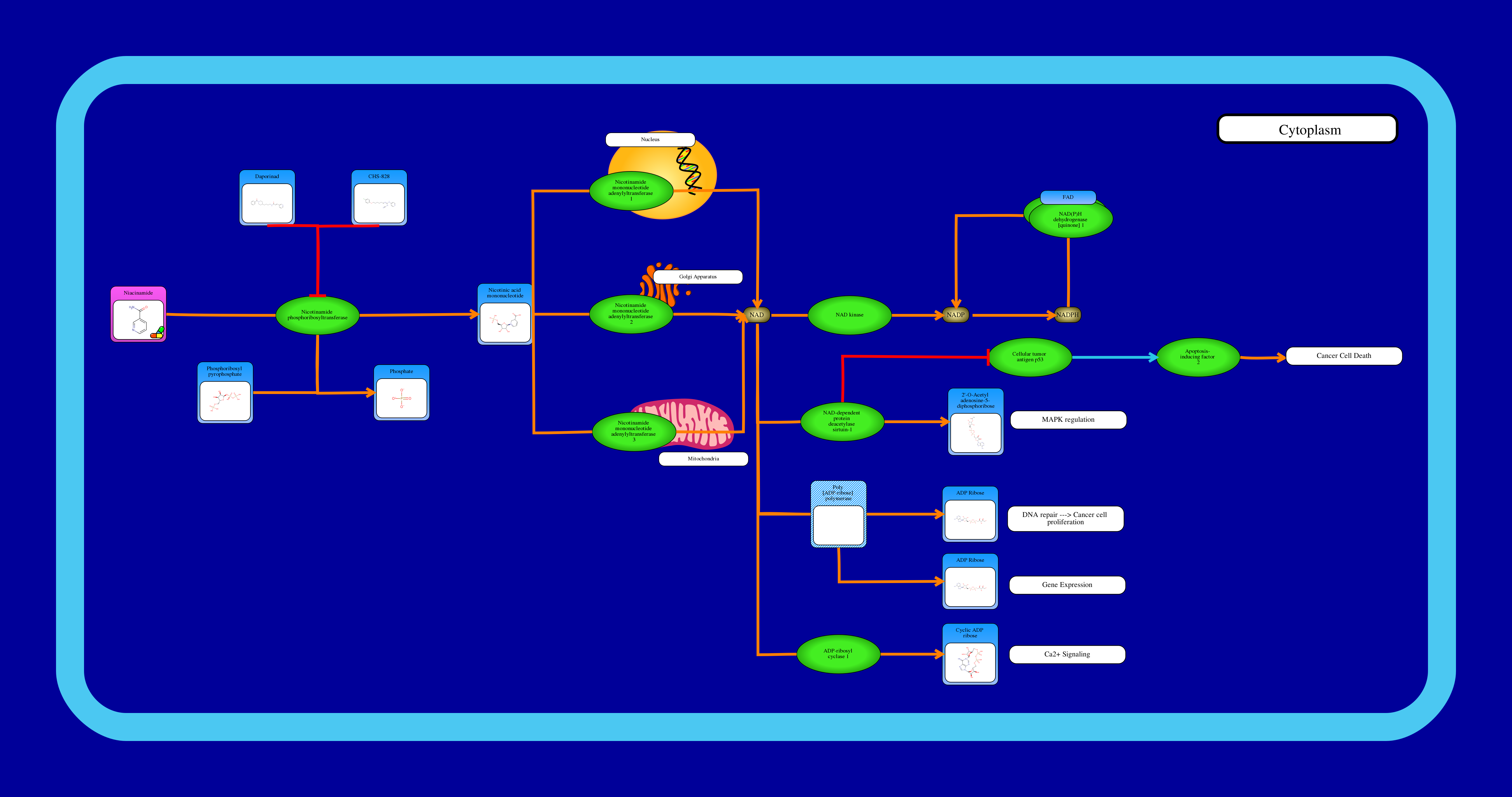 NAD+-dependent signalling pathways regulate many fundamental processes such as DNA repair, DNA transcription, cell proliferation, cell survival, cell cycle progression, apoptosis, and metabolism. These pathways are all linked to cancer development. Degradation of NAD will activate various biosynthetic pathways, which are crucial for incessant cancer cell proliferation.
