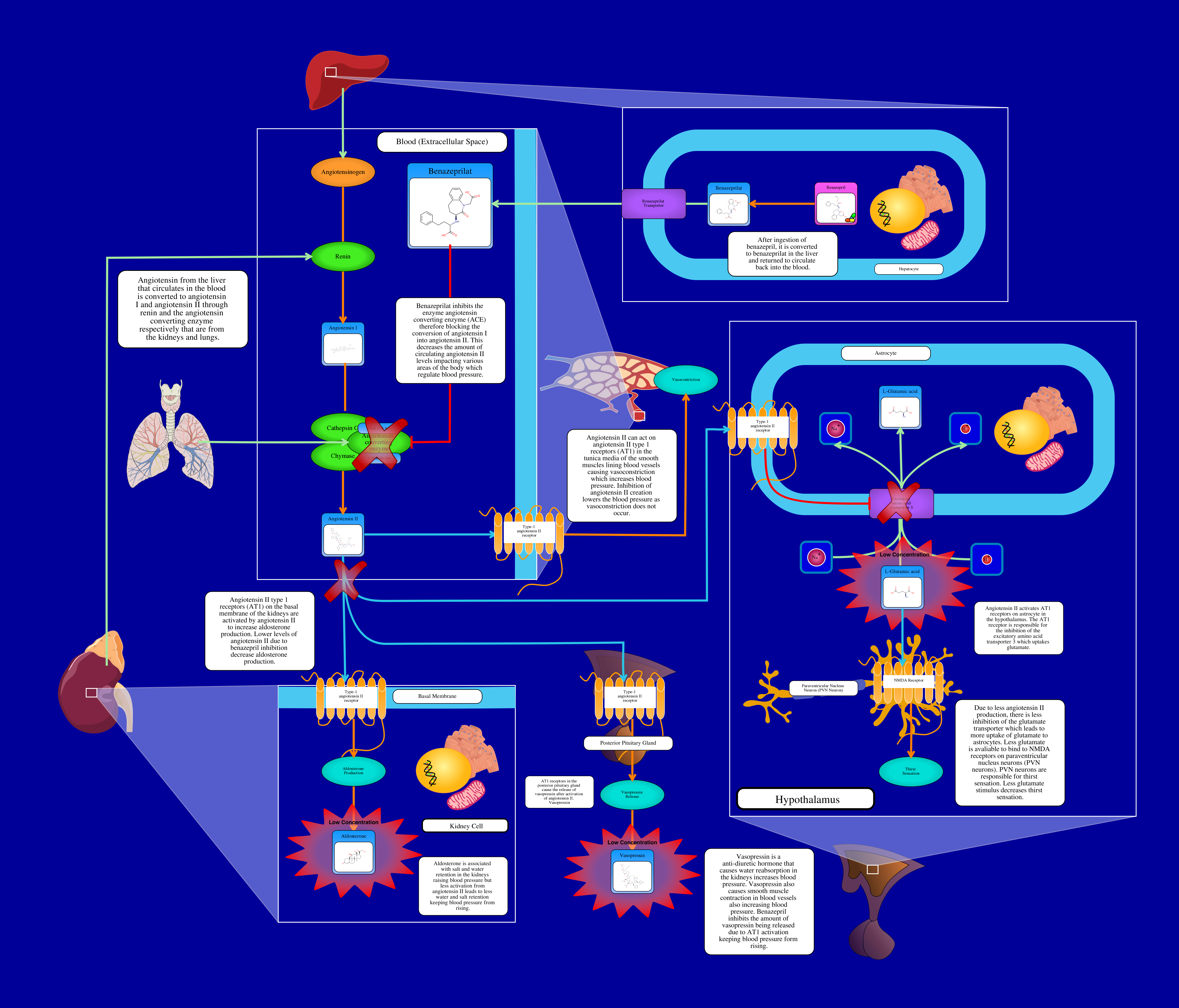 Benazepril is angiotensin converting enzyme (ACE) inhibitor for the conversion of angiotensin I into angiotensin II. Angiotensin II is a critical circulating peptide hormone that has powerful vasoconstrictive effects and increases blood pressure. Benazepril is used to treat hypertension, high blood pressure, congestive heart failure, and chronic renal failure as it decreases blood pressure. Benazepril is converted into benazeprilat through the liver after being ingested which travels in the blood to inhibit ACE which is from the lungs. Angiotensin has many vasoconstrictive effects by binding to angiotensin II type 1 receptors (AT1) in blood vessels, kidneys, hypothalamus, and posterior pituitary. In blood vessels AT1 receptors cause vasoconstriction in the tunica media layer of smooth muscle surrounding blood vessels increasing blood pressure. Less angiotensin II that is circulating lowers the constriction of these blood vessels. AT1 receptors in the kidney are responsible for the production of aldosterone which increases salt and water retention which increases blood volume. Less angiotensin II reduces aldosterone production allowing water retention to not increase. AT1 receptors in the hypothalamus are on astrocytes which inhibit the excitatory amino acid transporter 3 from up-taking glutamate back into astrocytes. Glutamate is responsible for the activation of NMDA receptors on paraventricular nucleus neurons (PVN neurons) that lead to thirst sensation. Since angiotensin II levels are lowered, the inhibition of the uptake transporter is not limited decreasing the amount of glutamate activating NMDA on PVN neurons that makes the individual crave drinking less. This lowers the blood volume as well. Lastly, the AT1 receptors on posterior pituitary gland are responsible for the release of vasopressin. Vasopressin is an anti-diuretic hormone that cases water reabsorption in the kidney as well as causing smooth muscle contraction in blood vessels increasing blood pressure. Less angiotensin II activating vasopressin release inhibits blood pressure from increasing. Overall, Benazelpril inhibits the conversion of angiotensin I into angiotensin II, a powerful vasoconstrictor and mediator of high blood pressure so decreasing levels of angiotensin will help reduce blood pressure from climbing in individuals.