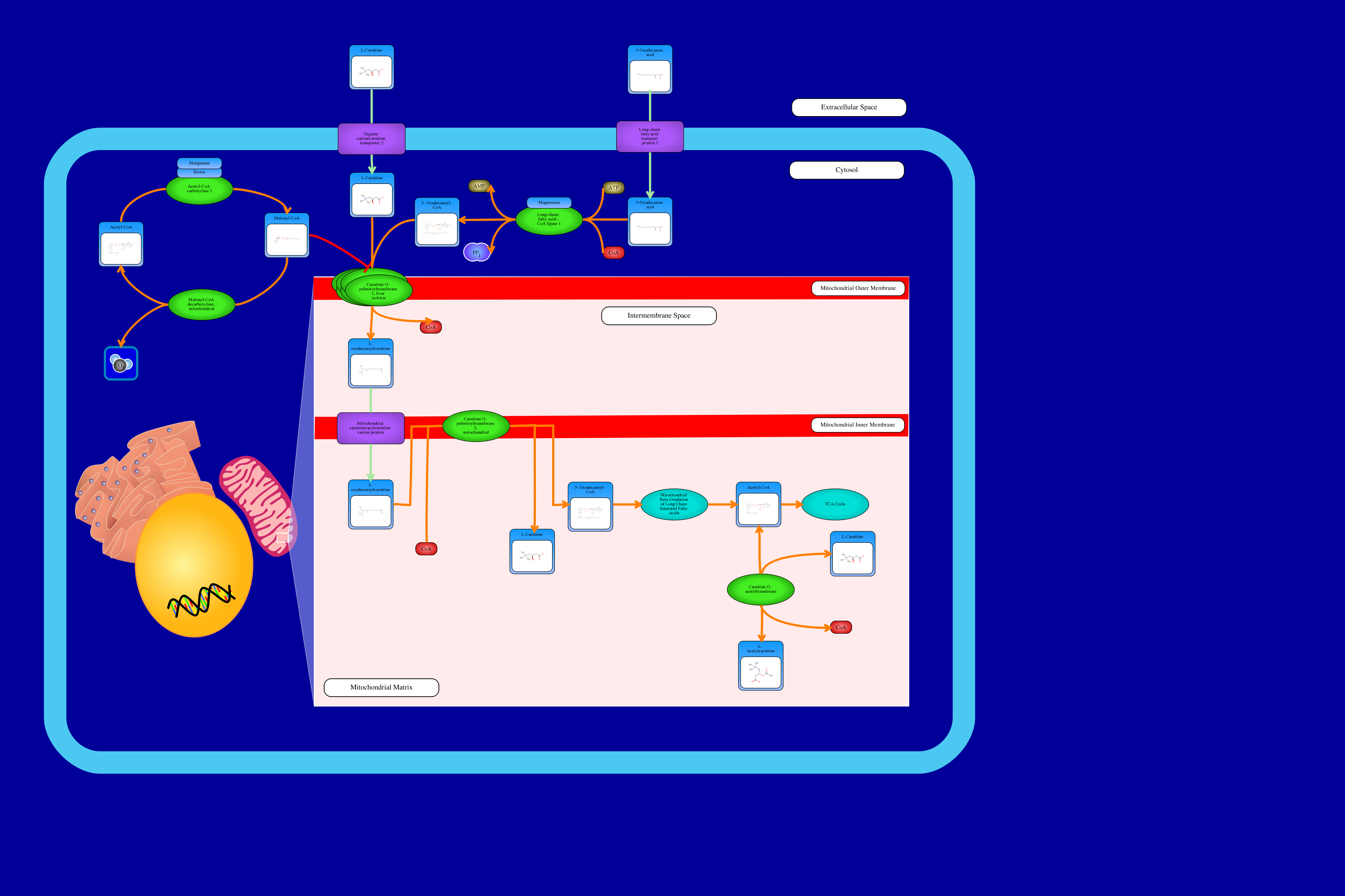 3-oxodecanoylcarnitine is an acylcarnitine. The general role of acylcarnitines is to transport acyl-groups, organic acids and fatty acids, from the cytoplasm into the mitochondria so that they can be broken down to produce energy. As part of this process, 3-oxodecanoic acid is first transported into the cell via the long-chain fatty acid transport protein 1 (FATP1). Once inside the cell it undergoes a reaction to form an acyl-CoA derivative called 3-oxodecanoyl-CoA. This reaction is facilitated by the long-chain fatty-acid CoA ligase 1 protein, which adds a CoA moiety to appropriate acyl groups. Many acyl-CoA groups will then further react with other zwitterionic compounds such as carnitine (to form acylcarnitines) and amino acids (to form acyl amides). The carnitine needed to form acylcarnitines inside the cell is transported into the cell by the organic cation/carnitine transporter 2. In forming an acylcarnitine derivative, 3-oxodecanoyl-CoA reacts with L-carnitine to form 3-oxodecanoylcarnitine. This reaction is catalyzed by carnitine O-palmitoyltransferase. This enzyme resides in the mitochondrial outer membrane. While this reaction takes place, the 3-oxodecanoylcarnitine is moved into the mitochondrial intermembrane space. Following the reaction, the newly synthesized acylcarnitine is transported into the mitochondrial matrix by a mitochondrial carnitine/acylcarnitine carrier protein found in the mitochondrial inner membrane. Once in the matrix, 3-oxodecanoylcarnitine can react with the carnitine O-palmitoyltransferase 2 enzyme found in the mitochondrial inner membrane to once again form 3-oxodecanoyl-CoA and L-carnitine. 3-oxodecanoyl-CoA then enters into the mitochondrial beta-oxidation pathway to form aceytl-CoA. Acetyl-CoA can go on to enter the TCA cycle, or it can react with L-carnitine to form L-acetylcarnitine in a reaction catalyzed by Carnitine O-acetyltransferase. This reaction can occur in both directions, and L-acetylcarnitine and CoA can react to form acetyl-CoA and L-carnitine in certain circumstances. Finally, acetyl-CoA in the cytosol can be catalyzed by acetyl-CoA carboxylase 1 to form malonyl-CoA, which inhibits the action of carnitine O-palmitoyltransferase 1, thereby preventing 3-oxodecanoylcarnitine from forming and thereby preventing it from being transported into the mitochondria.