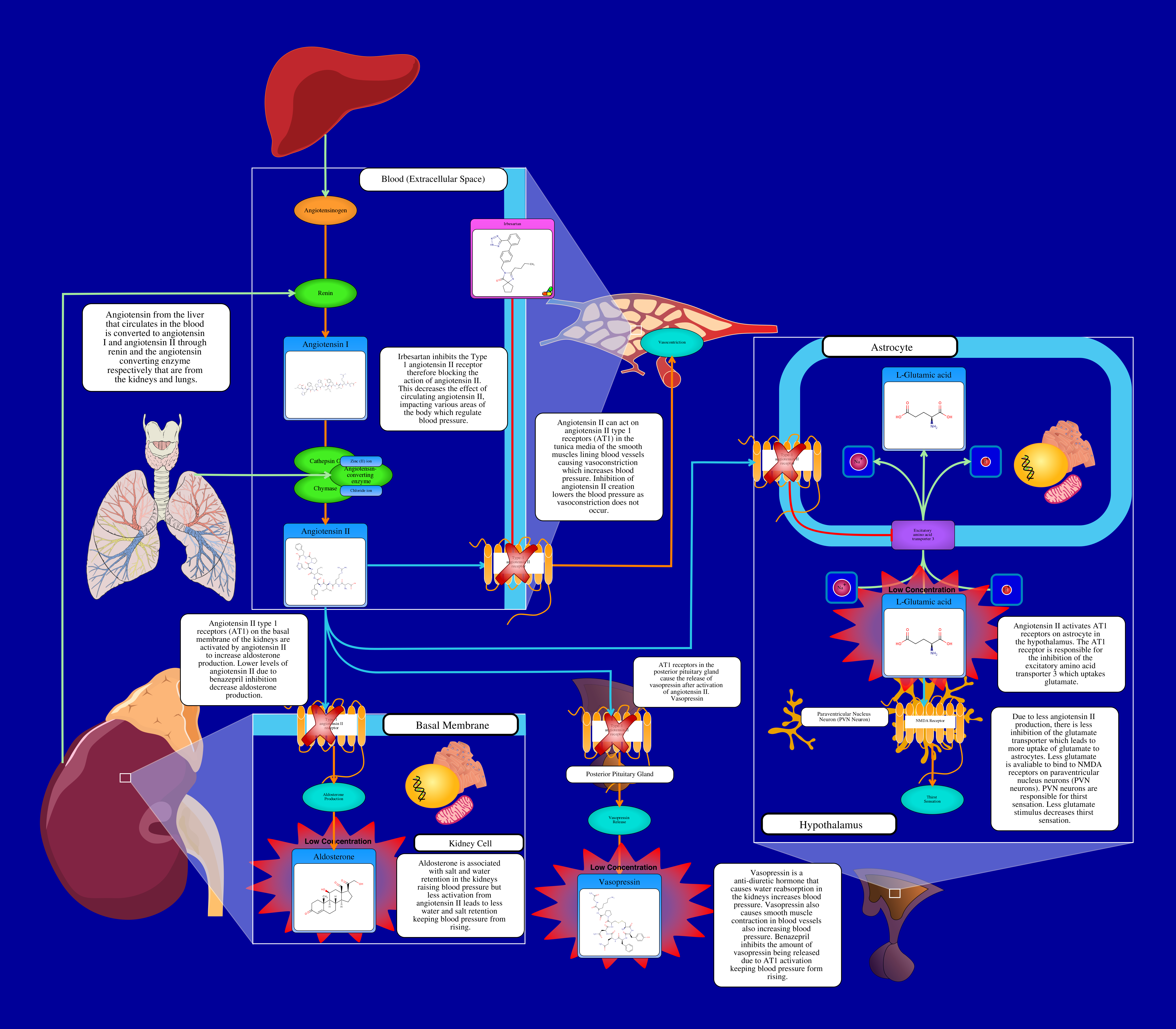 In blood vessels AT1 receptors cause vasoconstriction in the tunica media layer of smooth muscle surrounding blood vessels increasing blood pressure. Blocking this AT1 receptor lowers the constriction of these blood vessels. AT1 receptors in the kidney are responsible for the production of aldosterone which increases salt and water retention which increases blood volume. Blocking AT1 receptors reduces aldosterone production allowing water retention to not increase. AT1 receptors in the hypothalamus are on astrocytes which inhibit the excitatory amino acid transporter 3 from up-taking glutamate back into astrocytes. Glutamate is responsible for the activation of NMDA receptors on paraventricular nucleus neurons (PVN neurons) that lead to thirst sensation. Since AT1 receptors are blocked, the inhibition of the uptake transporter is not limited decreasing the amount of glutamate activating NMDA on PVN neurons that makes the individual crave drinking less. This lowers the blood volume as well.