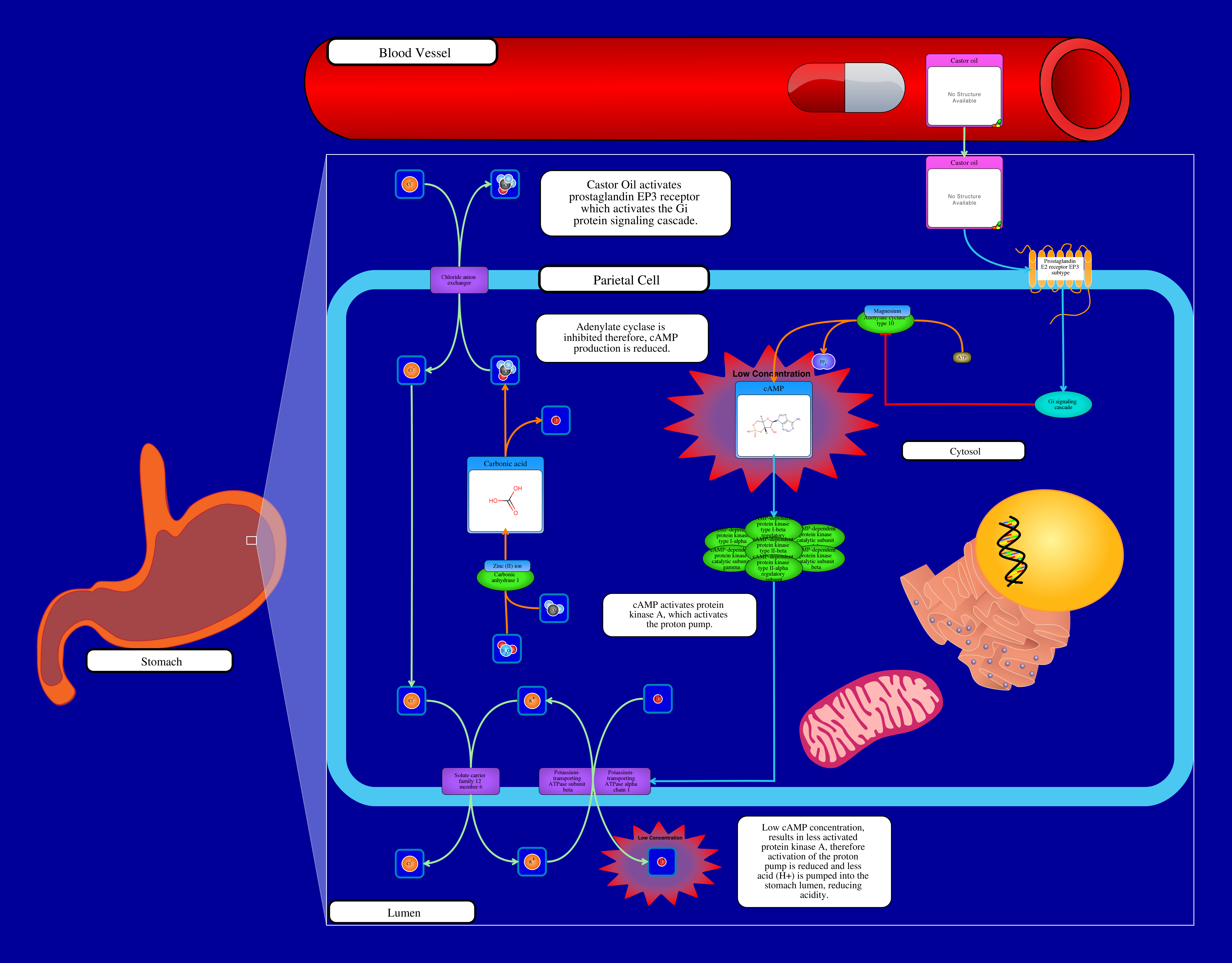 Castor Oil is a prostaglandin E1 analog that reduces the risk of NSAID-induced gastric ulcers. Castor Oil stimulates prostaglandin receptors on parietal cells in the stomach to reduce gastric acid secretion. Castor Oil activates prostaglandin EP3 receptors in parietal cells. Activation of this receptor triggers the Gi protein signaling cascade, inhibiting adenylate cyclase. Adenylate cyclase is responsible for converting ATP to cAMP, therefore, inhibition of adenylate cyclase reduces cytosolic cAMP concentration. cAMP is responsible for activating protein kinase A. With lower concentrations of cAMP, less protein kinase A is activated. Protein kinase A activates the proton pump in the luminal membrane of the parietal cell. The role of the proton pump is to secrete acid (H+) into the stomach lumen. With reduced protein kinase A activation, this decreases the activity of the proton pump, fewer H+ ions are pumped into the lumen, reducing the acidity and thus allowing stomach ulcers to heal and reducing the pain caused by the ulcers. Castor Oil may also promote ulcer healing by increasing mucus and bicarbonate secretion and thickening the mucosal bilayer so the mucosa can generate new cells.