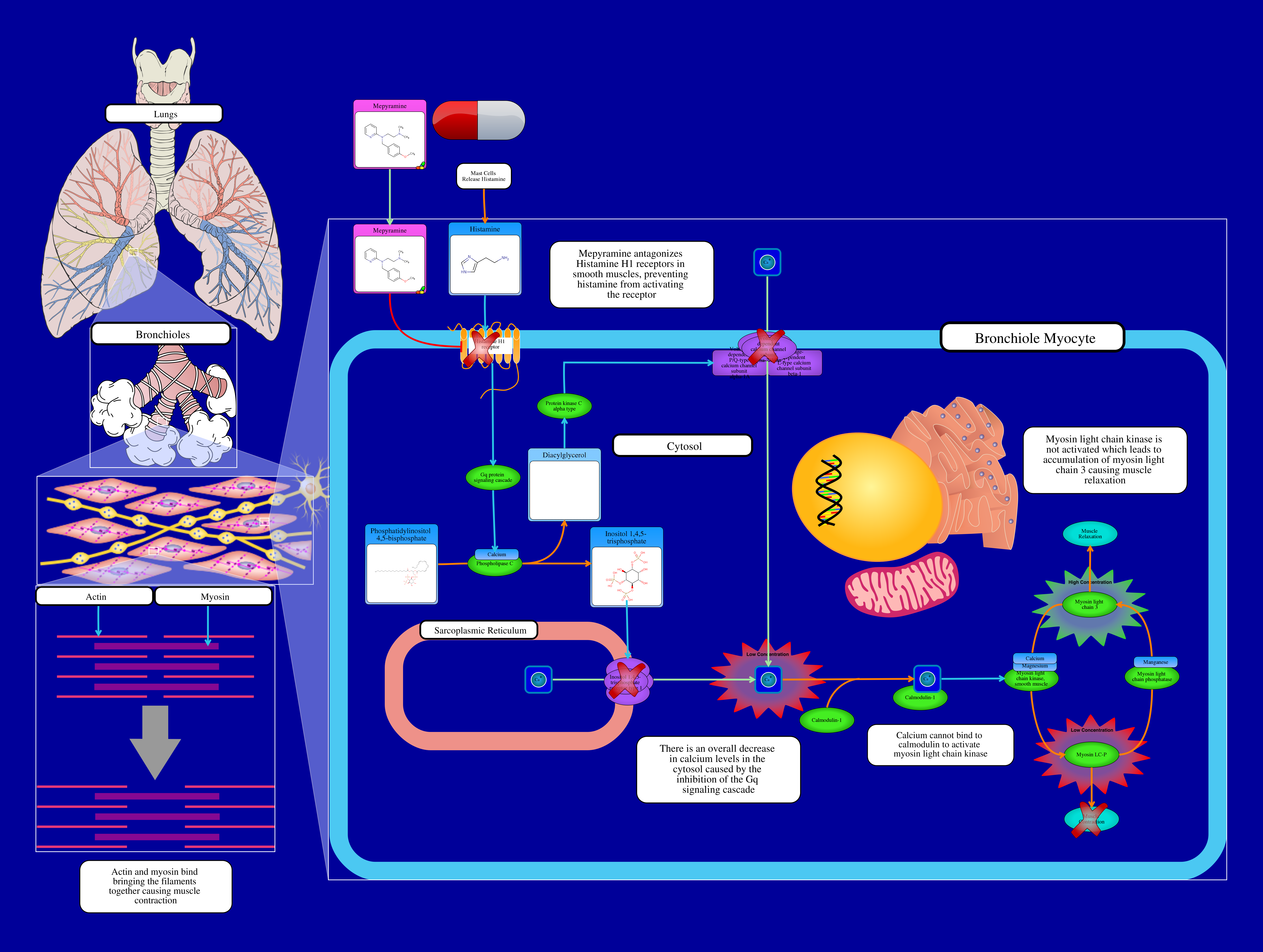 H1-antihistamines interfere with the agonist action of histamine at the H1 receptor and are administered to attenuate inflammatory process in order to treat conditions such as allergic rhinitis, allergic conjunctivitis, and urticaria. H1-antihistamines act on H1 receptors in T-cells to inhibit the immune response, in blood vessels to constrict dilated blood vessels, and in smooth muscles of lungs and intestines to relax those muscles. Allergies causes blood vessel dilation which causes swelling (edema) and fluid leakage. Mepyramine also inhibits the H1 histamine receptor on bronchiole smooth muscle myocytes. This normally activates the Gq signalling cascade which activates phospholipase C which catalyzes the production of Inositol 1,4,5-trisphosphate (IP3) and Diacylglycerol (DAG). Because of the inhibition, IP3 doesn't activate the release of calcium from the sarcoplasmic reticulum, and DAG doesn't activate the release of calcium into the cytosol of the endothelial cell. This causes a low concentration of calcium in the cytosol, and it, therefore, cannot bind to calmodulin.Calcium bound calmodulin is required for the activation of myosin light chain kinase. This prevents the phosphorylation of myosin light chain 3, causing an accumulation of myosin light chain 3. This causes muscle relaxation, opening up the bronchioles in the lungs, making breathing easier.